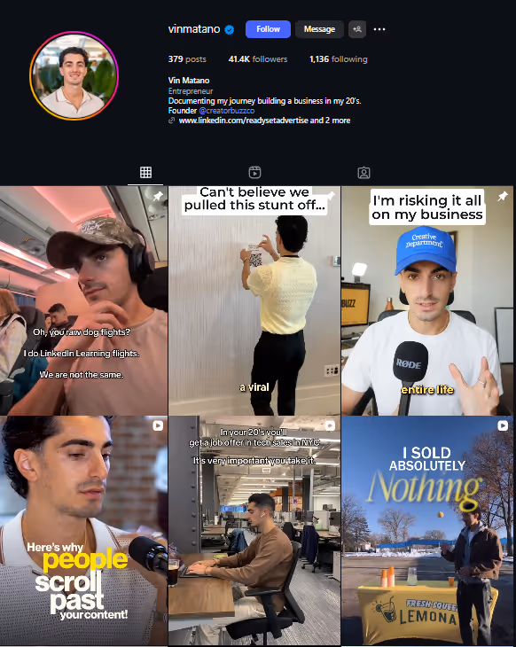 Vin Matano does the opposite. He documents the journey, process, struggles, wins and failures while building his B2B company. Vin doesn’t present himself as a “finished success.” His content openly shows: Early struggles, In-progress thinking, Lessons learned while building in public.