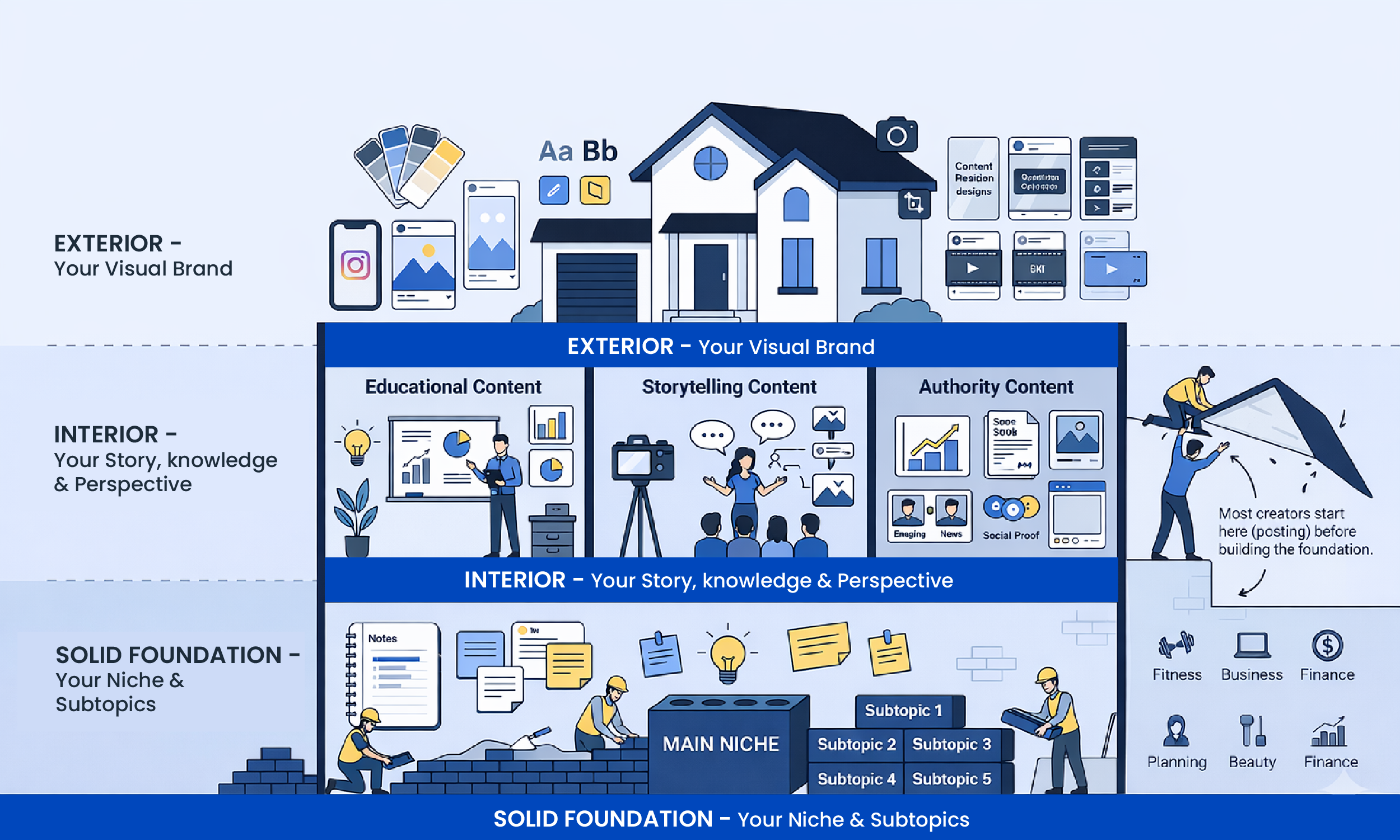 Your personal branding on Instagram works exactly the same way. And most creators fail because they start with the roof (exterior) they start posting, before they've laid a single brick. (foundation)