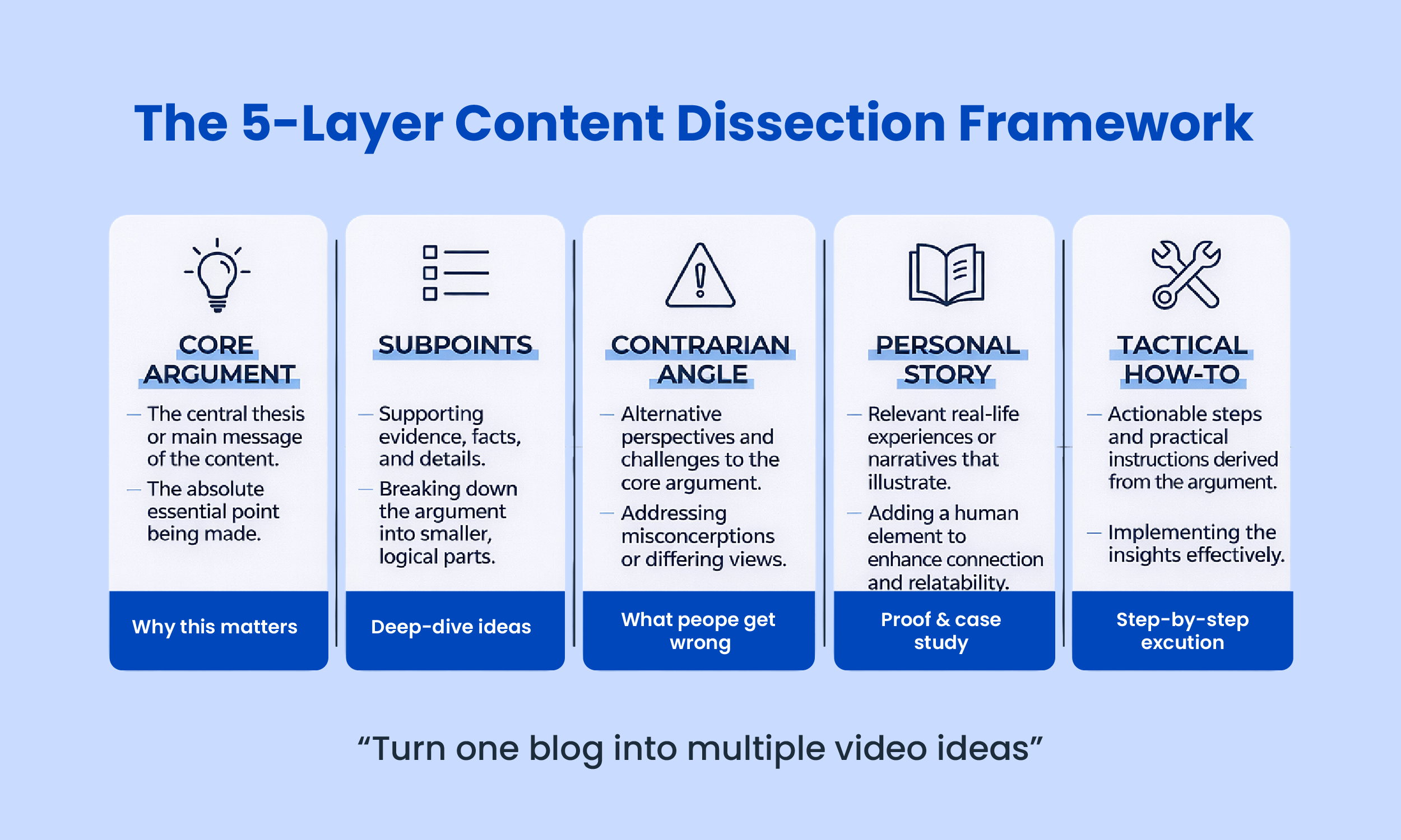 Most content creators only mine Layer 2, the section-by-section breakdown. But the highest-performing videos on every platform in 2026 come from Layers 1, 3, 4, and 5, which most people completely ignore.